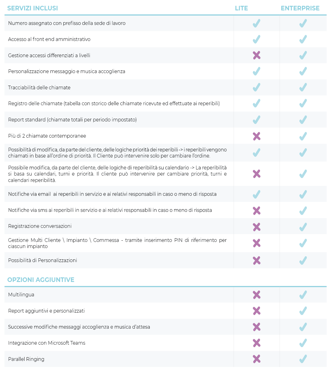 La versione Enterprise si rivolge a tutte quelle aziende che necessitano di un servizio di reperibilità in Cloud, che sia semplice sia nella gestione che nell’utilizzo e che sia personalizzabile a seconda delle proprie necessità. Inoltre è integrabile con i sistemi del cliente.